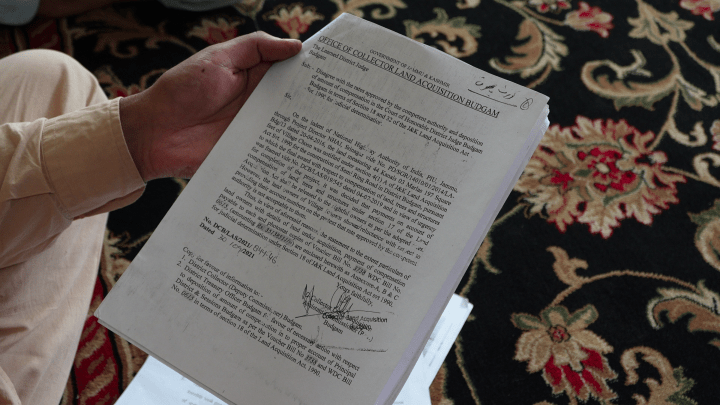 Gulam Nabi Bhat, a farmer in his mid-sixties from Budgam district, walks me through what remains of his fields in Wathoora village, at the base of the Damodar Karewa, the plateau that now hosts the Srinagar airport. The newly built Srinagar Semi Ring Road cuts directly through this landscape. Wathoora alone has lost around 225 kanals of prime farmland to the project. Gulam Nabi stops beside his small patch of surviving land, where, with the help from the horticulture department, he has planted a high-density apple orchard. He tells me he lost eight kanals (one acre) to the road construction. The remaining part of his land now stays waterlogged for months; the road’s elevated embankment blocks the natural flow of water, turning his field into a shallow pool after every rainfall.